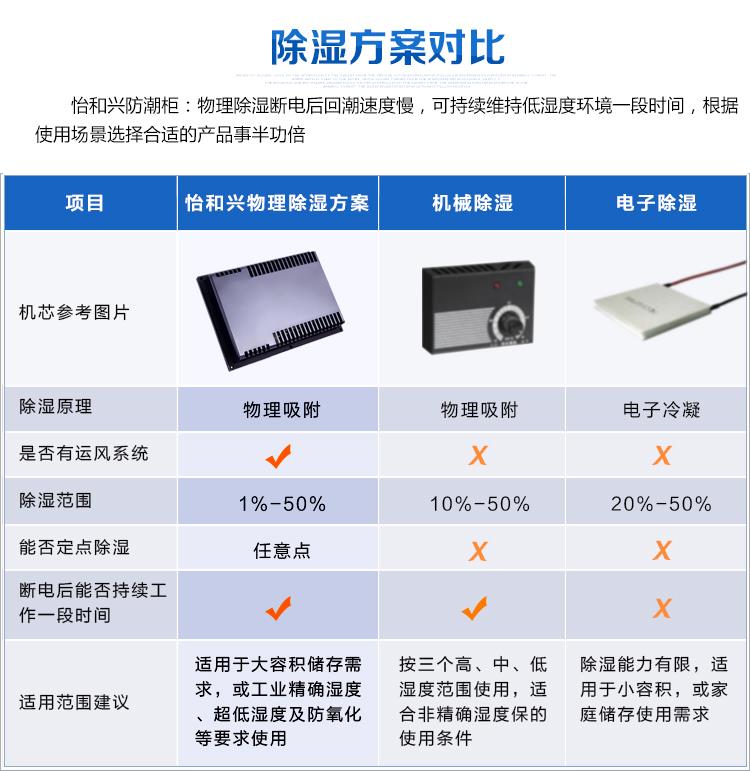 民用防潮箱与工业级防潮柜的除湿系统有很大差异。民用防潮箱多用于储存一些贵重物品,如单反镜头、邮票、古董字画、茶叶等的防潮存储,其除湿系统采用的是简易化的半导体冷凝芯片除湿技术,其制造成本低廉,所用材料,内部结构,工作原理都无法与工业级防潮箱相媲美。例如,工业级电子防潮柜采用的温湿度敏感探头是工业级的,精度,分辨率,误差与民用防潮箱的对比具有很大的差异。民用防潮箱多采用民用温湿度液晶显示仪表,市场价格百元以下,而工业级电子防潮箱的温湿度敏感探头的市场价格是千元级的,液晶显示仪表在低于20%RH湿度下无法正常分辨,误差较大,工业级的温湿度传感器探头可以精确分辨1~99%RH范围;且民用防潮箱的温湿度仪表寿命一般较短,故障率较高,温湿度年飘逸误差较大,而工业级的产品使用寿命长久,误差较小,且有严格的校准测试标准,因此,工业级防潮箱在出厂时会经过多种检测和测试,并且出厂时会附带出厂的合格的测试报告,另外,民用防潮箱除湿模块是档位调节方式,即使是数字式设定的,也是范围控制,无法做到定值控制,而工业级的电子防潮箱则是定值准确控制。
